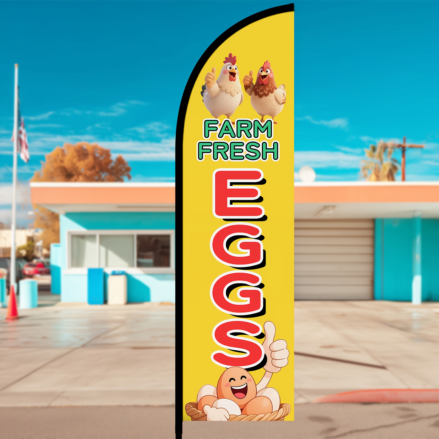 This fresh eggs feather flag helps you promote farm-fresh produce with high visibility and rustic charm.