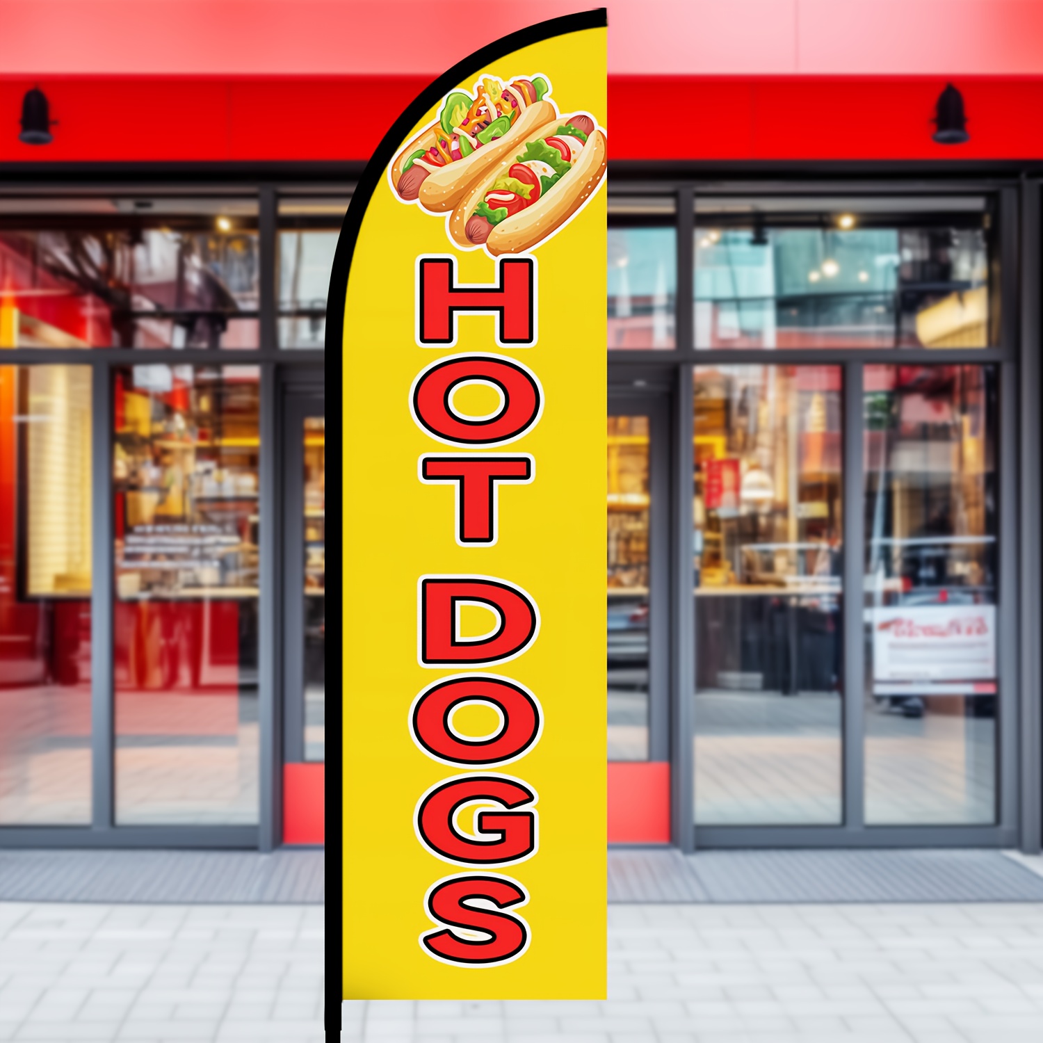 A striking banner featuring bold 'Hot Dogs' lettering on a tall feather flag design quickly draws the eye and entices hungry onlookers.