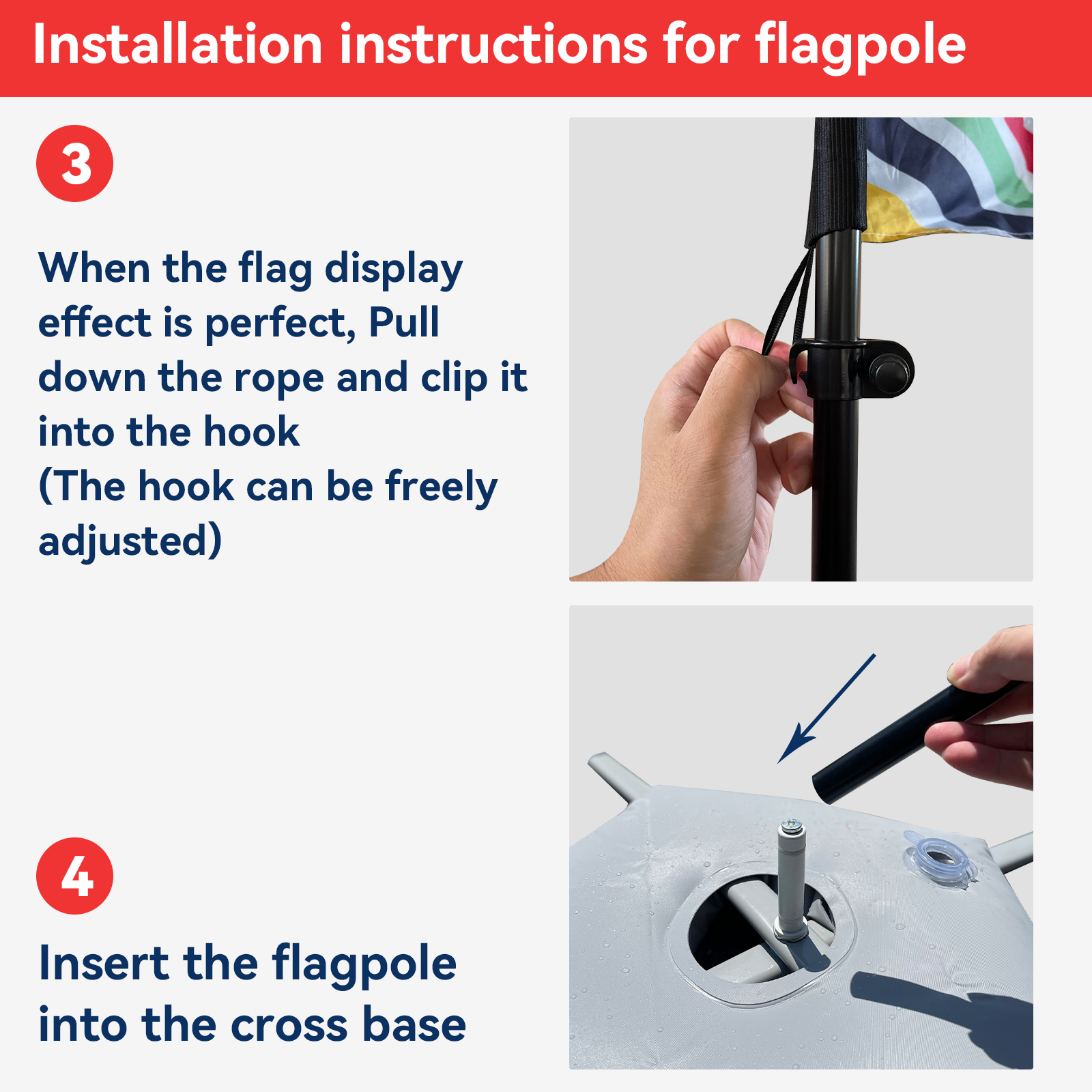 The flagpole needs to be purchased separately. We offer various types of flagpoles, including ground insertion, cross base, and more. You can choose the appropriate flagpole type based on the usage scenario. If you need a flagpole, please contact our email. We have very favorable flagpole options on other platforms.
